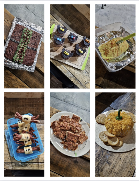 What better way to kick-off the 2023 Spooky Bake Off than with John & Becky Drake’s eagerly-anticipated Tiffin (bottom centre)?! A favourite every year, this delicious and not remotely scary entry was a judge-pleaser for sure. And although she may’ve been dressed for the macabre, Carman’s First Stab at Food Colouring (top right) was far from morbid. A vibrant lemon drizzle with a gruesome-green hue got the thumbs up from judges. “Is there nothing Coach Jodie can’t do?!” Seemingly not! Her Freaky Fingers (top left) escaping from a chocolatey-crypt were a hit with the crowd despite how gruesome those green digits looked!